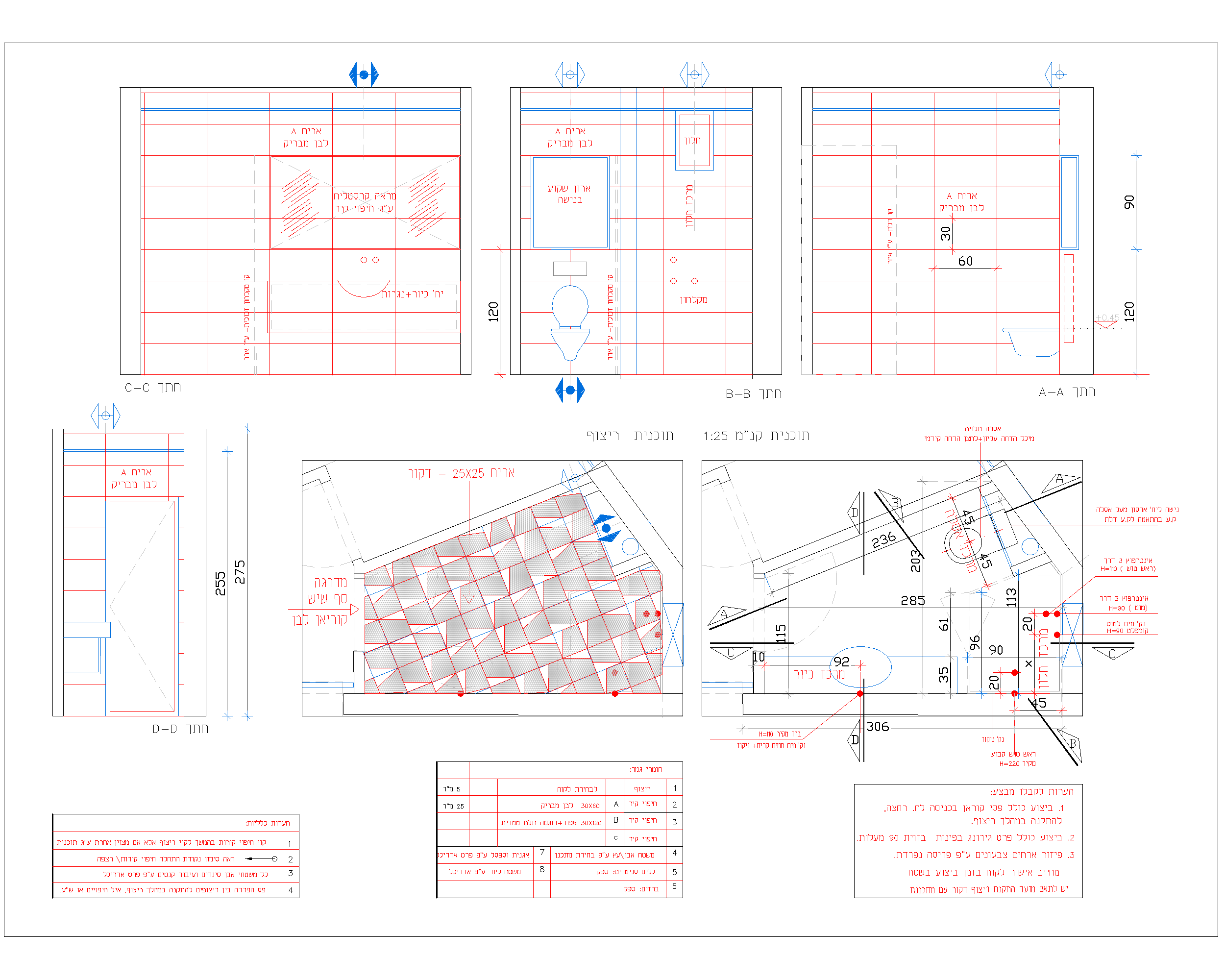 תוכנית מקומית מפורטת לקבלן בקנה מידה מוגדל (1:25) כולל מיקומי כלים סניטרים עפ"י תוכנית לקוח. בנוסף, התוכנית מציגה מידות, מפלסים ושאר הנחיות טכניות (נקודת מים חשמל ותאורה) לכל הכנות בחדר רחצה. מבט לכל חזית (קיר) עם פירוט והנחיות לבנית נישות תוכנית כוללת טבלה לפירוט כמיות ריצוף וחיפוי, ורשימת שאר מוצרים (ברזים וכלים לבנים) לטובת הצעות מחיר מספקים.